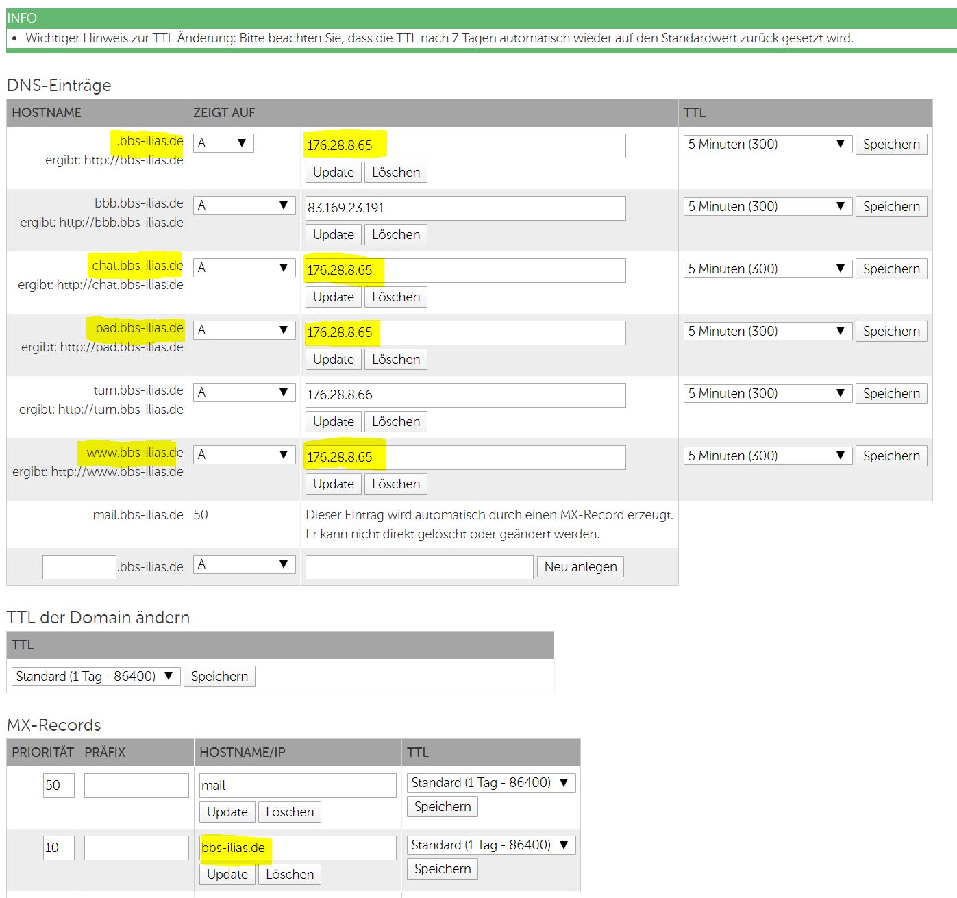 Product Admin - Domainservices - Domain-Administration - Nameserver- / DNS... - For example, the IP of the server is 176.28.8.65 and my FQDN is bbs-ilias.de. In this case, your config can/should look like the following.