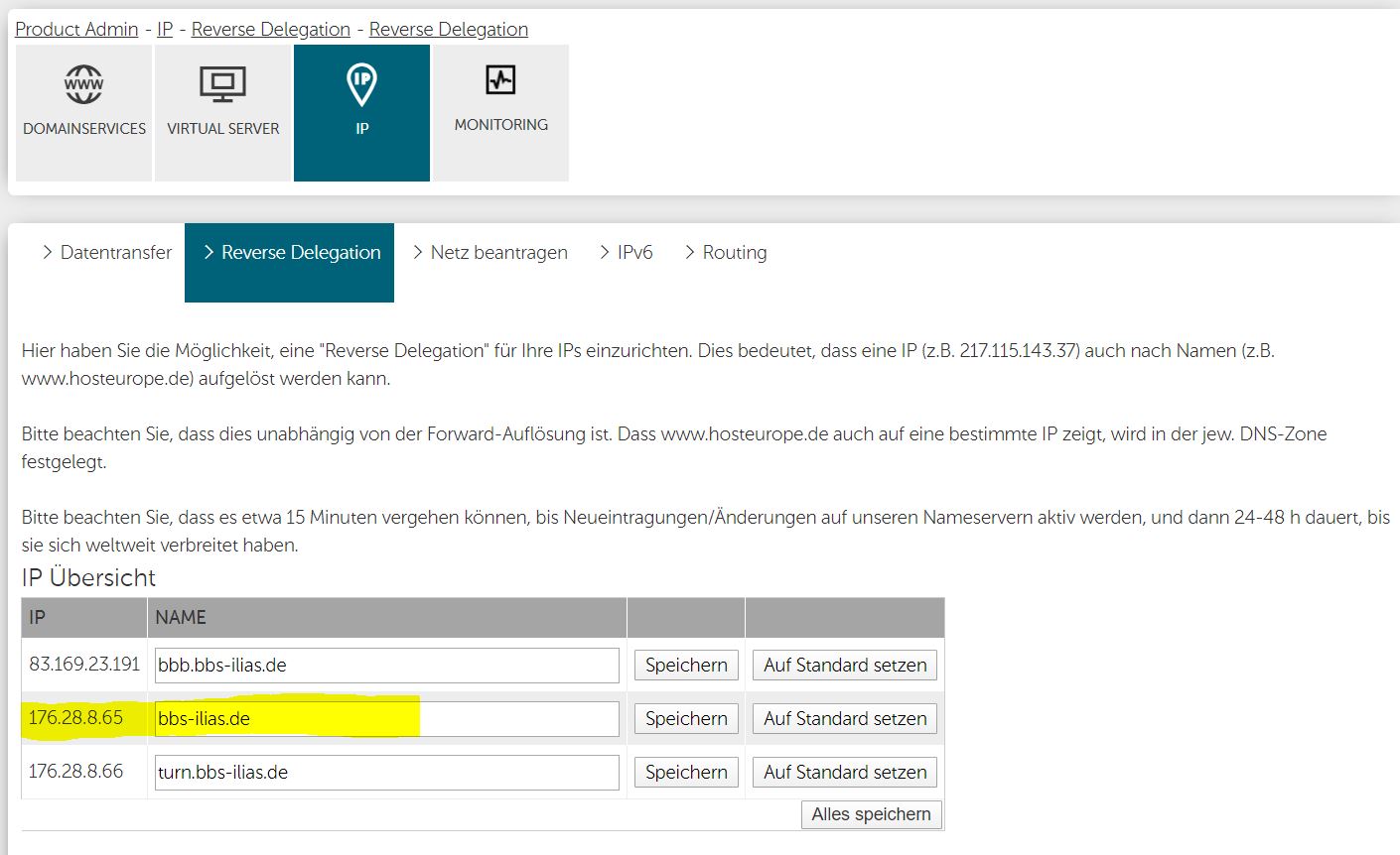 Product Admin - Domainservices - Domain-Administration - Nameserver- / DNS... - For example, the IP of the server is 176.28.8.65 and my FQDN is bbs-ilias.de. In this case, your config can/should look like the following.