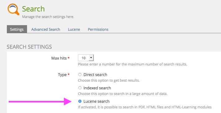 - Activate the Lucene search in Administration->Search. Ignore any errors befor you have updated the searchindex for the 1st time (see following step).