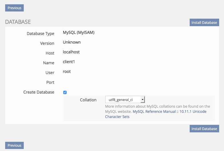 Im nächsten Fenster wählen wir "Create Database" mit der Kollation "utf8_general_ci":