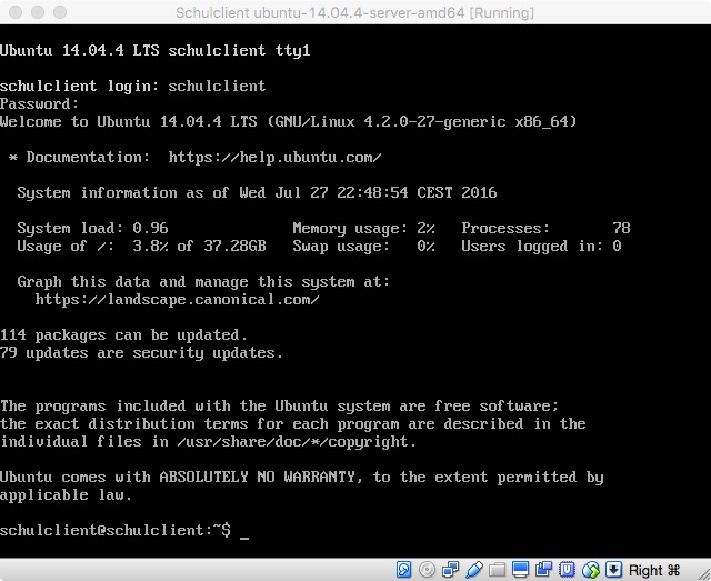 Wir loggen uns über die Konsole von VirtualBox direkt ein mit dem User/Passwort schulclient: