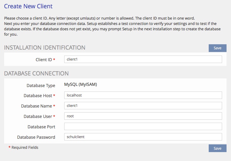 Dort müssen wir den Datenbankuser einstellen, in unserem Falle root mit dem Passwort schulclient. In einem Produktivsystem wird dies natürlich mit einem anderen User gemacht. Das Ganze sieht dann so aus: