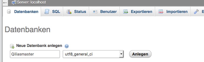Im nächsten Fenster wählen wir "Create Database" mit der Kollation "utf8_general_ci":