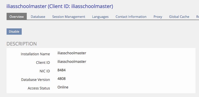 Der obige Code ist von einem Blogeintrag von mir kopiert und muss angepasst werden. Wir benötigen die beiden Client-IDs und die zugehörigen NIC-IDs, welche wir im ILIAS-Setup Details->Overview erhalten. Ebenso muss der ILIAS-INI-Pfad angepasst werden, da unser ILIAS-Verzeichnis sich nicht in /var/www/info sondern in /var/www/html/ilias befindet. Unten können wir die Daten ablesen: