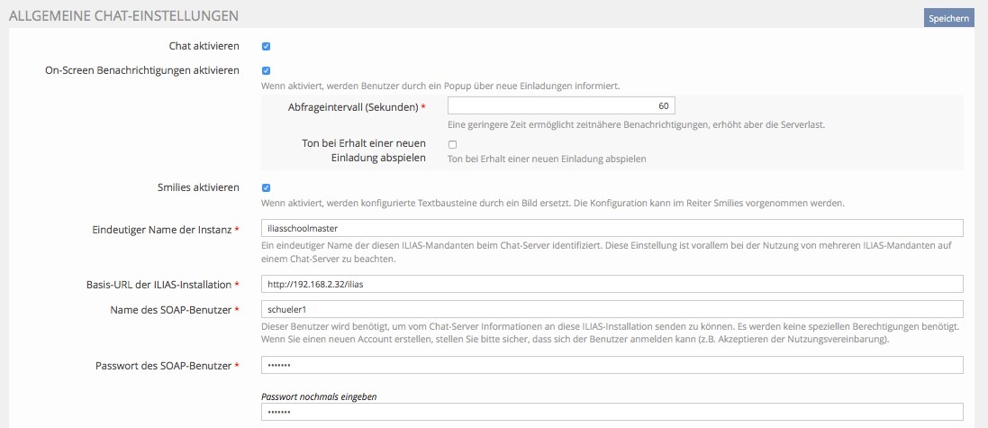 Hinweis: Man benötigt einen User, der sich einloggen kann (hier: schueler1) und man muss die Instanz eindeutig benennen. Das Bild unten zeigt die Einstellung des Clients iliasschoolmaster (nicht client1, den wir beim Chat vernachlässigen).