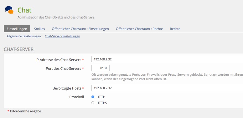 Unter Administraton->Chat geben wir nun die obigen Daten ein und aktivieren ihn natürlich: