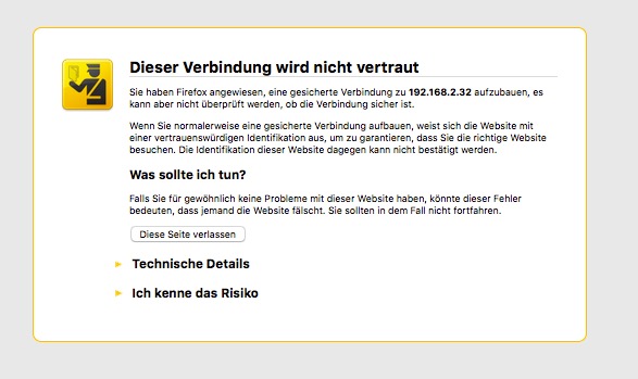 Ruft man nun den Server über den Browser via https auf, erscheint diese Meldung (in Firefox):